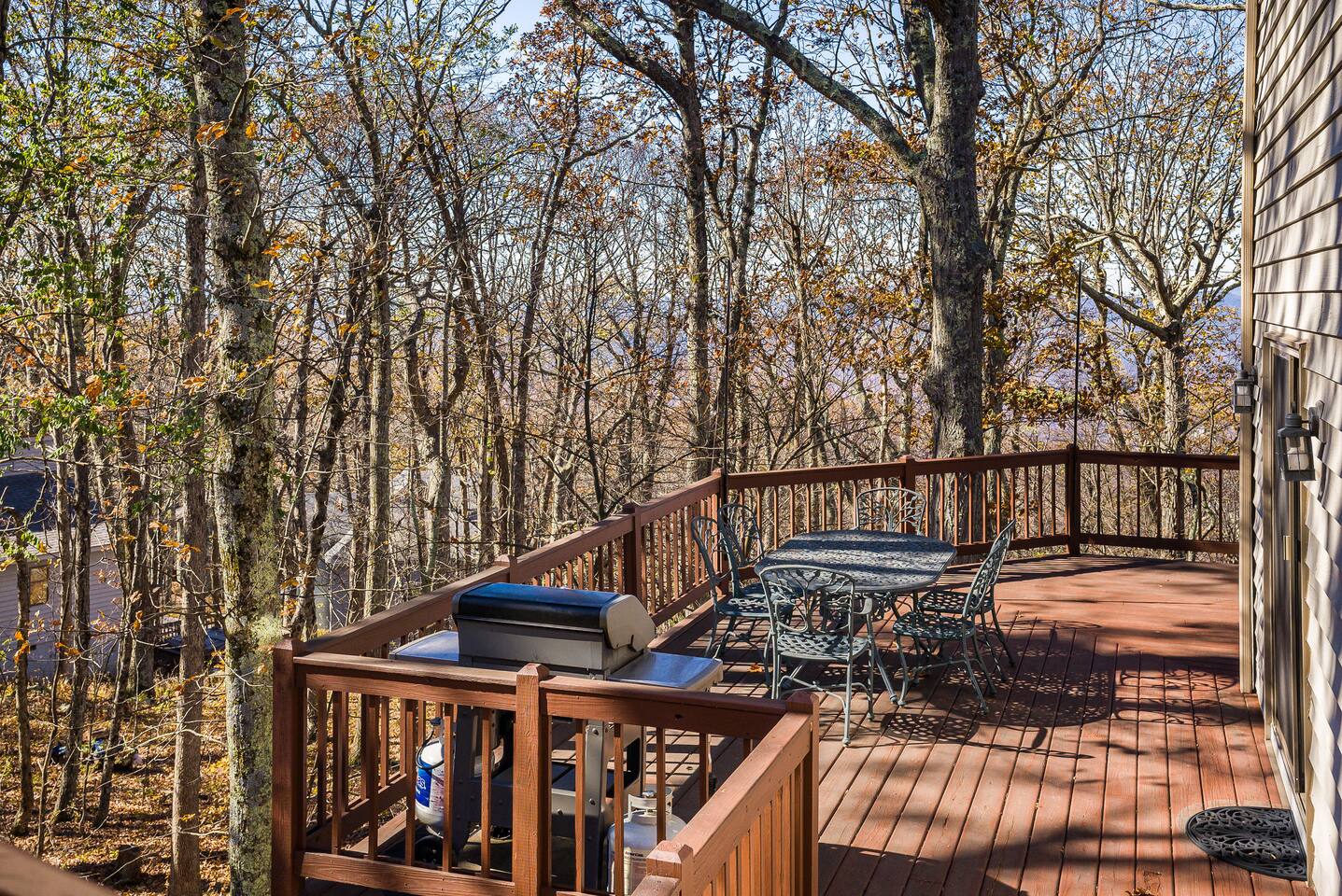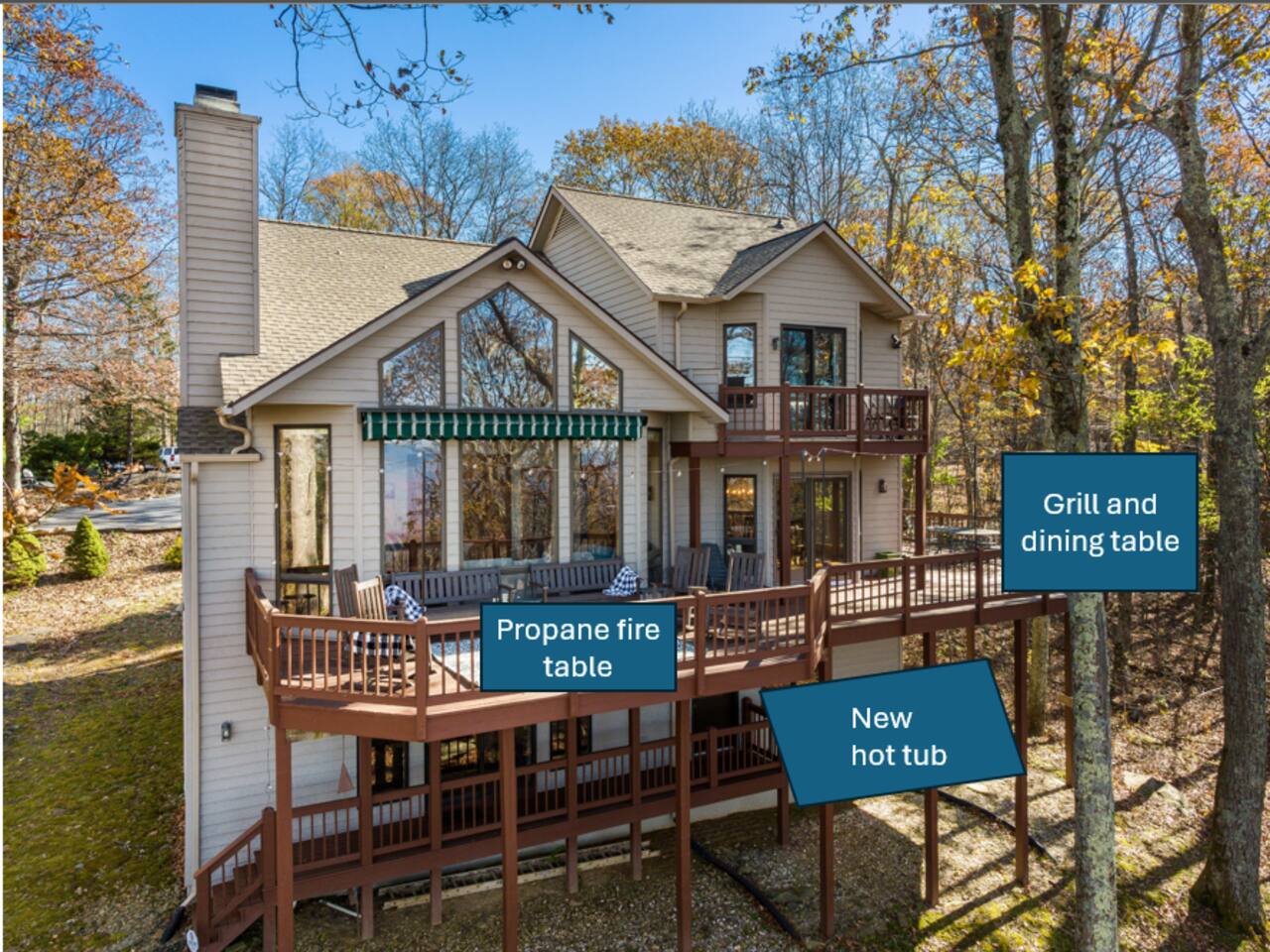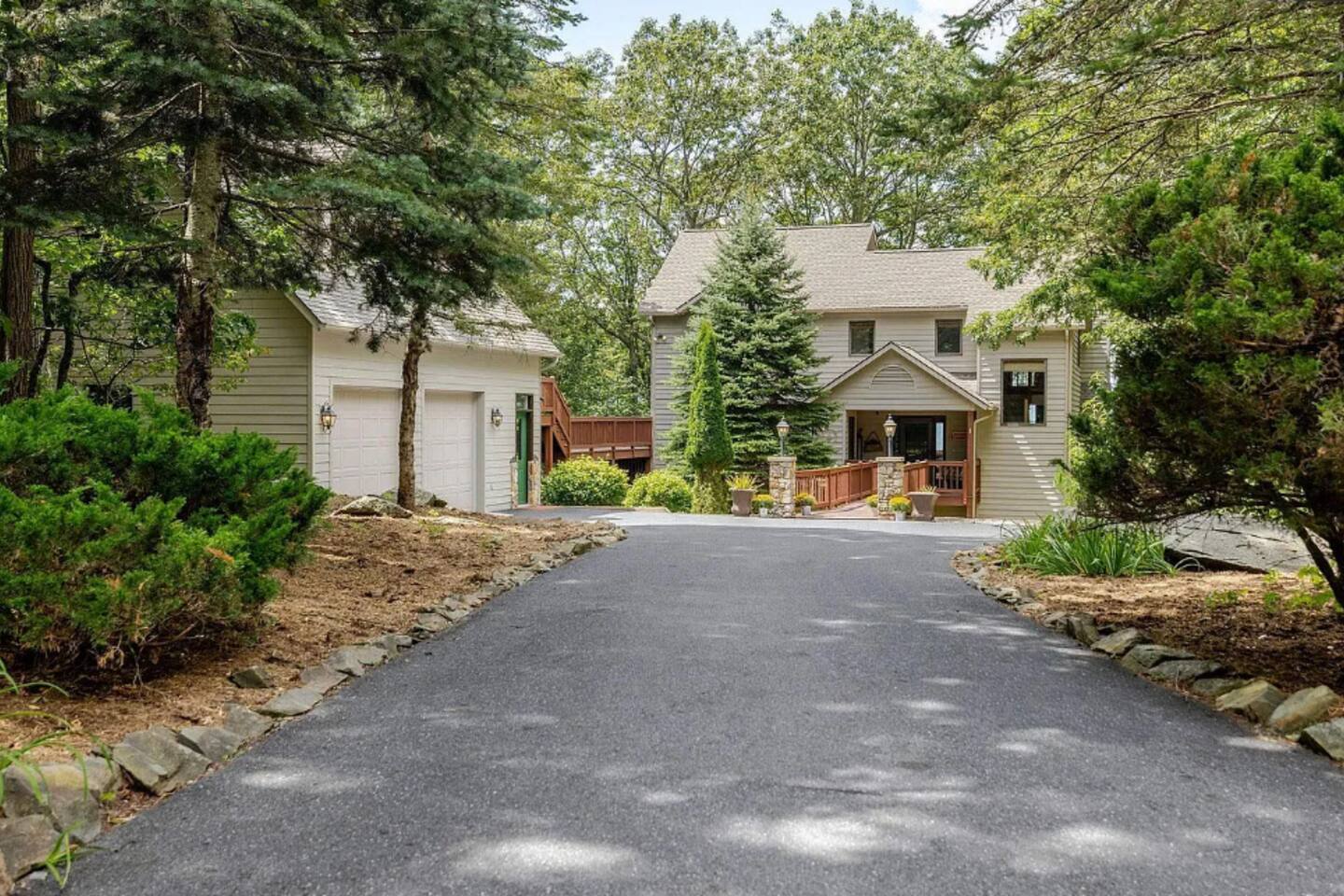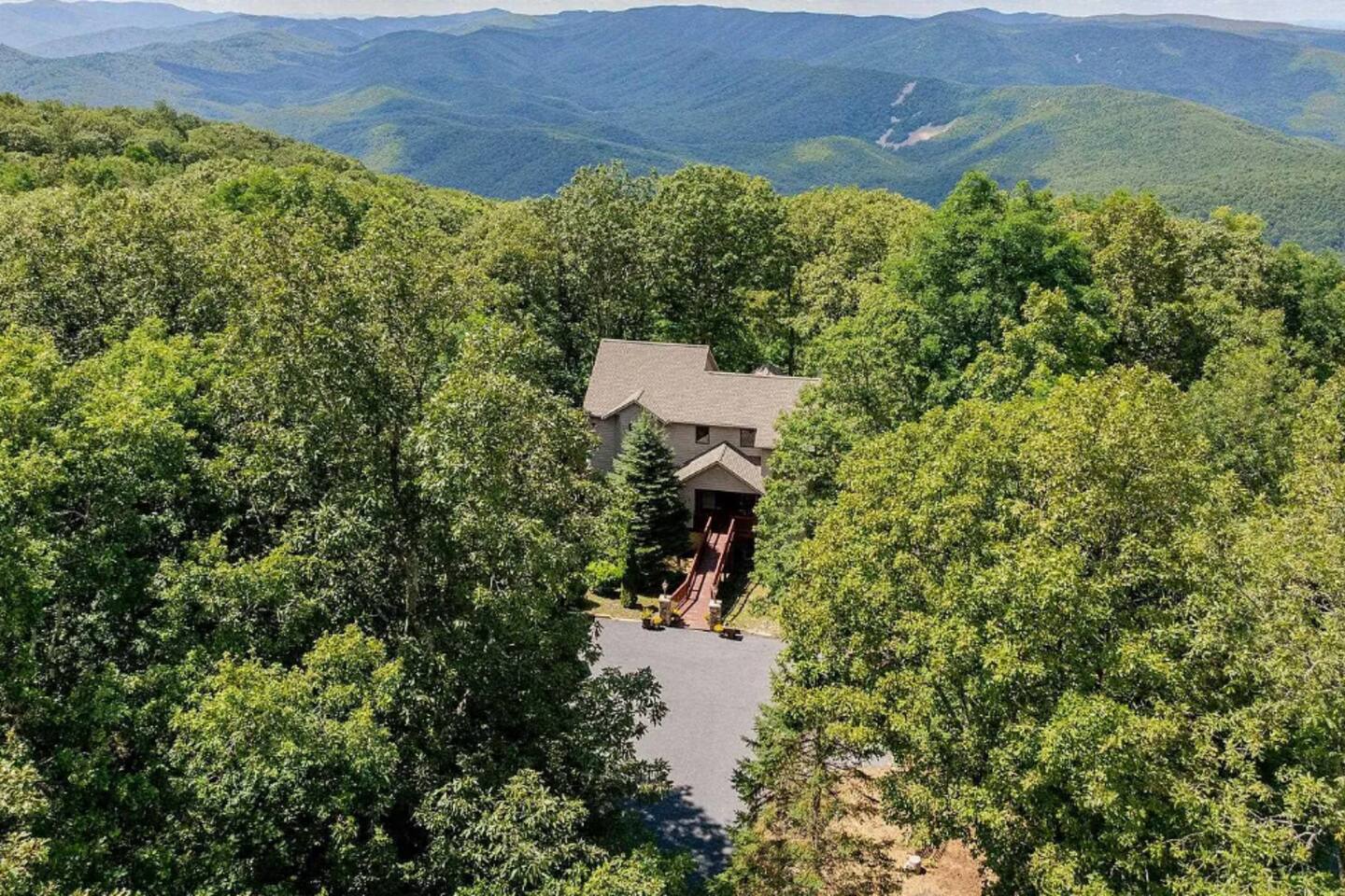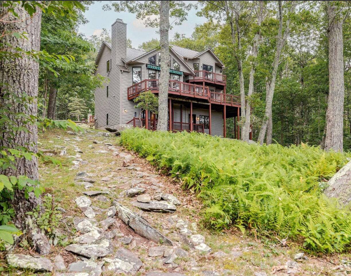 Escape to the mountains at this 5BR/4.5BA home in Wintergreen! Enjoy breathtaking Blue Ridge Mountain views, cozy evenings by the firepit, 8-person hot tub, and direct trail access to the Old Appalachian Trail right from your backyard. Perfect for families, groups, and outdoor lovers. Spacious & Fun: There is a main house and "tree house" over the garage accessible from the deck off of the main house. The main floor of the main house features an open living room with ample seating, open kitchen and dining room and half bath. The upstairs features two bedrooms; one king and one twin bunkbed. The downstairs features another living space with rock climbing wall and two bedrooms; one king and one with two bunk beds. The treehouse has one bedroom with bathroom. Gather Together: The large kitchen is fully equipped for group cooking and flows into a dining area with seating for 14 - perfect for family meals and game nights. After exploring, unwind on the deck with a glass of wine and take in the mountain sunset. Sleeping Arrangements: 4 bedrooms in the main house and 1 bedroom in the treehouse. • 2 upstairs in main house: King bed w/ ensuite bathroom + twin bunk bed room • 2 downstairs in main house: King bed w/ ensuite bathroom + 2 twin bunk beds room w/ bathroom outside room • 1 treehouse: King bed and twin bed with trundle with full bath (4.5 bathrooms total) Extras You’ll Love: • Garbage removal service (no trash hauling!) • Washer & dryer • Plenty of parking Adventure Awaits: Step right onto the yellow-blazed trail that connects to the Old Appalachian Trail. Stunning overlook 1/5 mile from the house. Book your stay and enjoy mountain views, outdoor adventure, and indoor fun for everyone.