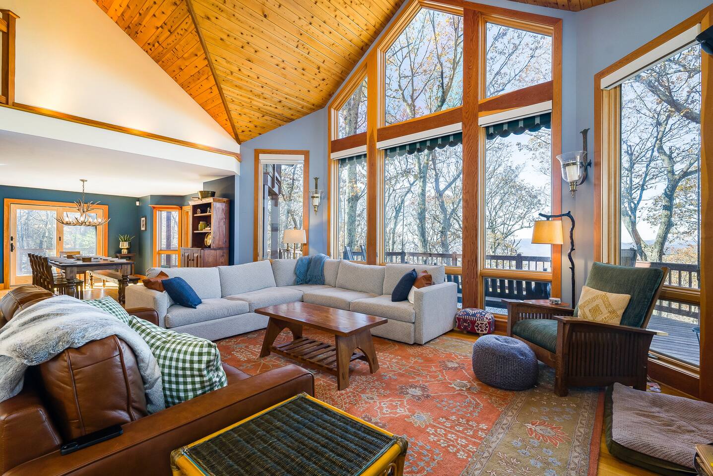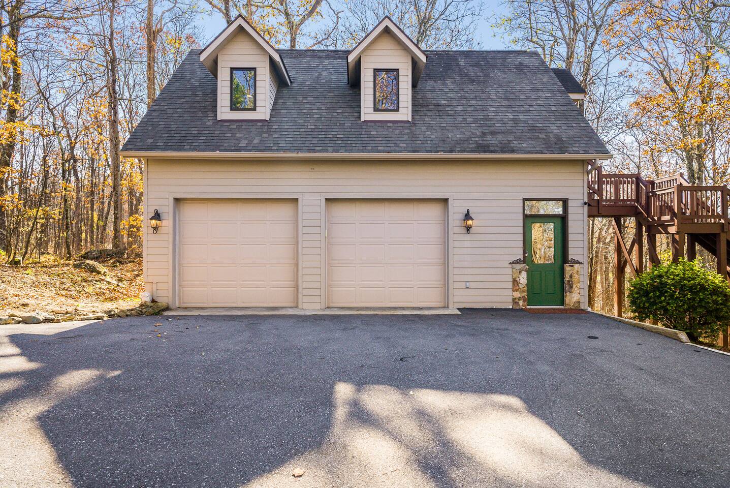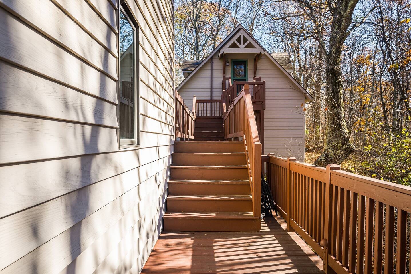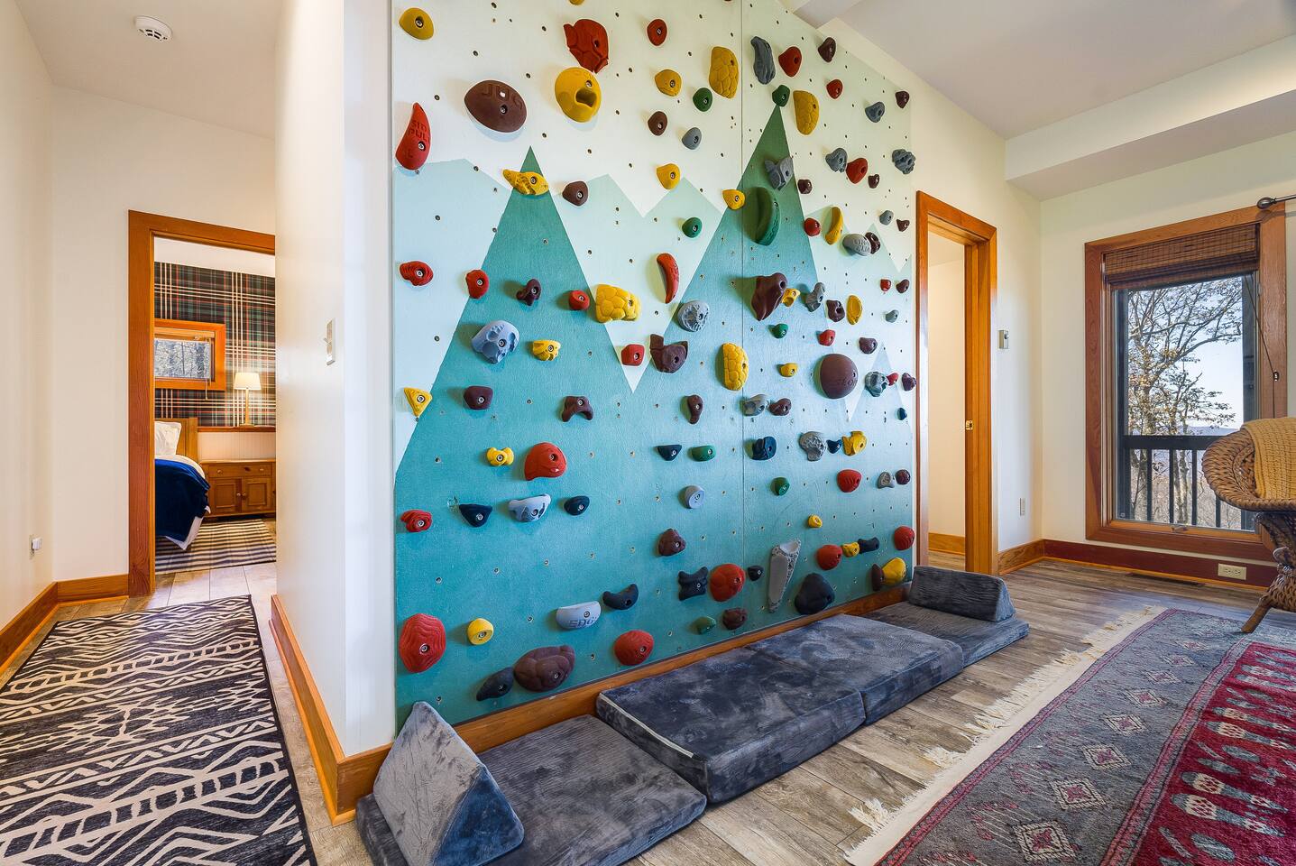 Escape to the mountains at this 5BR/4.5BA home in Wintergreen! Enjoy breathtaking Blue Ridge Mountain views, cozy evenings by the firepit, 8-person hot tub, and direct trail access to the Old Appalachian Trail right from your backyard. Perfect for families, groups, and outdoor lovers. Spacious & Fun: There is a main house and "tree house" over the garage accessible from the deck off of the main house. The main floor of the main house features an open living room with ample seating, open kitchen and dining room and half bath. The upstairs features two bedrooms; one king and one twin bunkbed. The downstairs features another living space with rock climbing wall and two bedrooms; one king and one with two bunk beds. The treehouse has one bedroom with bathroom. Gather Together: The large kitchen is fully equipped for group cooking and flows into a dining area with seating for 14 - perfect for family meals and game nights. After exploring, unwind on the deck with a glass of wine and take in the mountain sunset. Sleeping Arrangements: 4 bedrooms in the main house and 1 bedroom in the treehouse. • 2 upstairs in main house: King bed w/ ensuite bathroom + twin bunk bed room • 2 downstairs in main house: King bed w/ ensuite bathroom + 2 twin bunk beds room w/ bathroom outside room • 1 treehouse: King bed and twin bed with trundle with full bath (4.5 bathrooms total) Extras You’ll Love: • Garbage removal service (no trash hauling!) • Washer & dryer • Plenty of parking Adventure Awaits: Step right onto the yellow-blazed trail that connects to the Old Appalachian Trail. Stunning overlook 1/5 mile from the house. Book your stay and enjoy mountain views, outdoor adventure, and indoor fun for everyone.