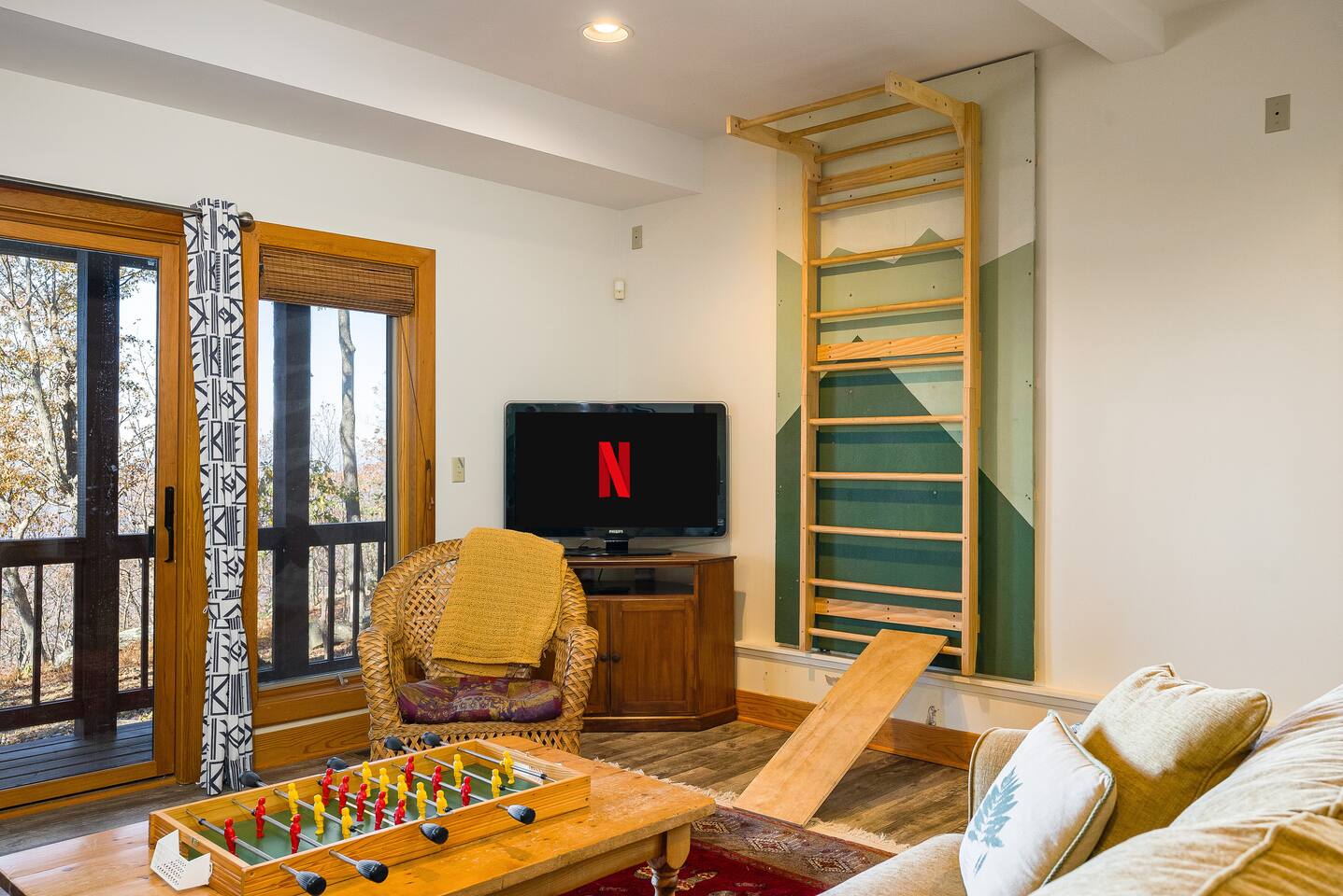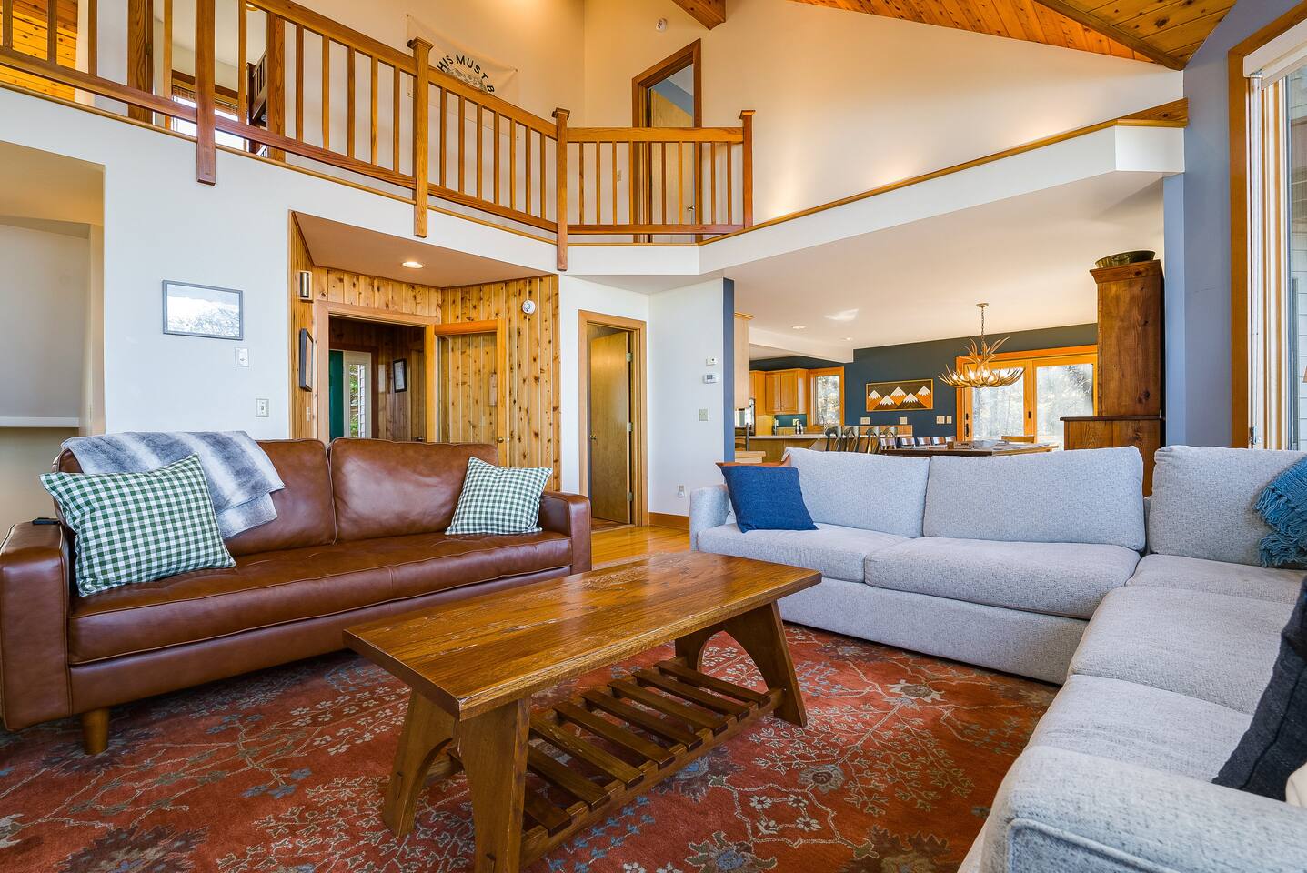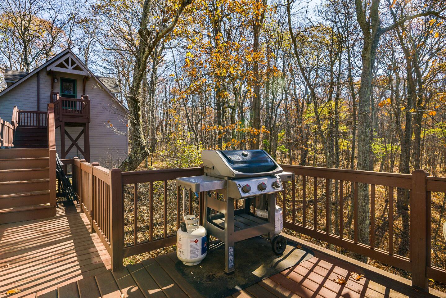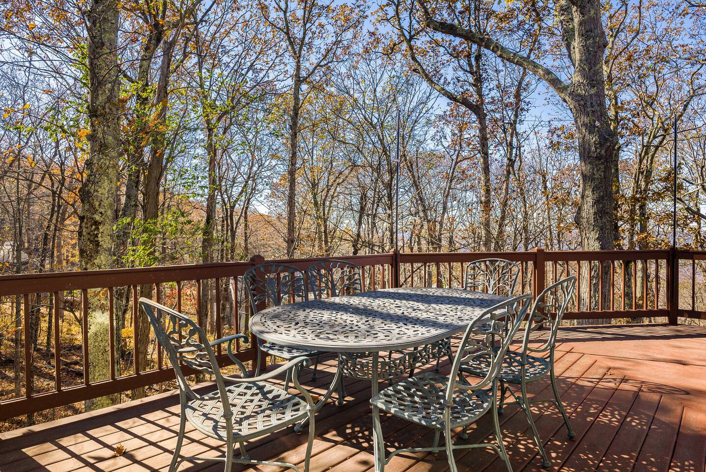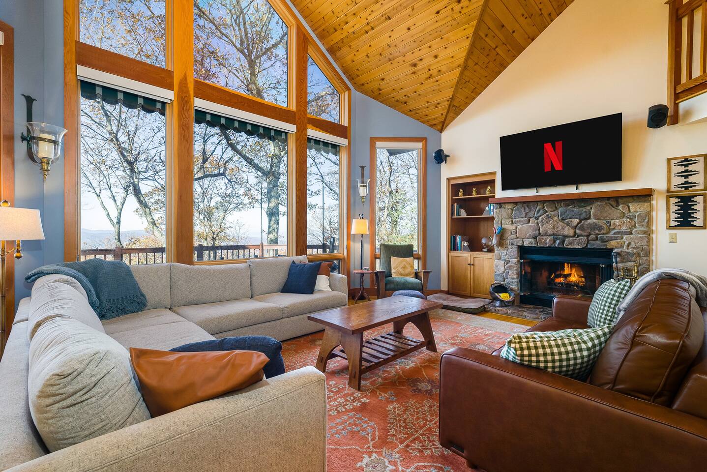 Escape to the mountains at this 5BR/4.5BA home in Wintergreen! Enjoy breathtaking Blue Ridge Mountain views, cozy evenings by the firepit, 8-person hot tub, and direct trail access to the Old Appalachian Trail right from your backyard. Perfect for families, groups, and outdoor lovers. Spacious & Fun: There is a main house and "tree house" over the garage accessible from the deck off of the main house. The main floor of the main house features an open living room with ample seating, open kitchen and dining room and half bath. The upstairs features two bedrooms; one king and one twin bunkbed. The downstairs features another living space with rock climbing wall and two bedrooms; one king and one with two bunk beds. The treehouse has one bedroom with bathroom. Gather Together: The large kitchen is fully equipped for group cooking and flows into a dining area with seating for 14 - perfect for family meals and game nights. After exploring, unwind on the deck with a glass of wine and take in the mountain sunset. Sleeping Arrangements: 4 bedrooms in the main house and 1 bedroom in the treehouse. • 2 upstairs in main house: King bed w/ ensuite bathroom + twin bunk bed room • 2 downstairs in main house: King bed w/ ensuite bathroom + 2 twin bunk beds room w/ bathroom outside room • 1 treehouse: King bed and twin bed with trundle with full bath (4.5 bathrooms total) Extras You’ll Love: • Garbage removal service (no trash hauling!) • Washer & dryer • Plenty of parking Adventure Awaits: Step right onto the yellow-blazed trail that connects to the Old Appalachian Trail. Stunning overlook 1/5 mile from the house. Book your stay and enjoy mountain views, outdoor adventure, and indoor fun for everyone.